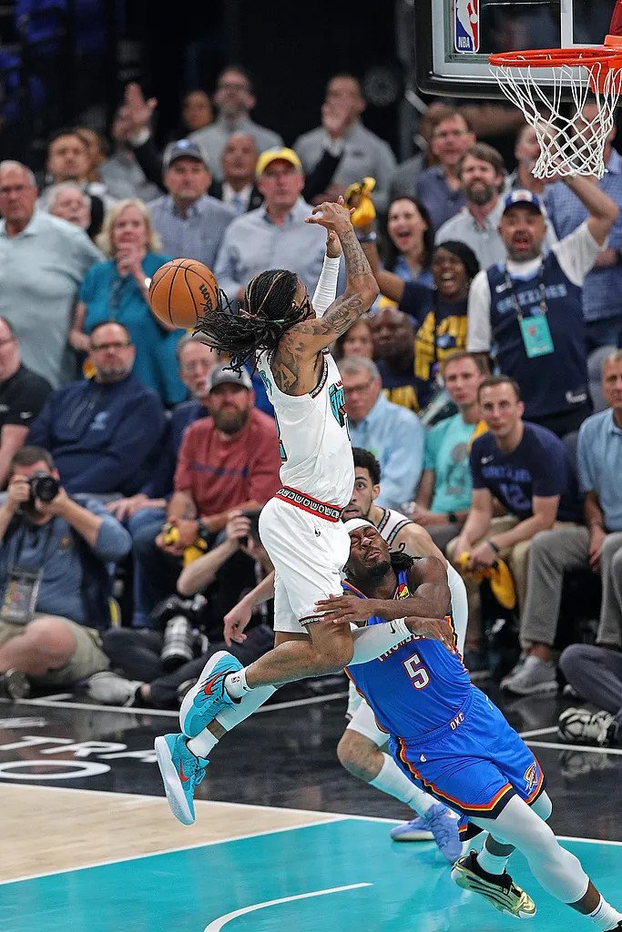 在雷霆与灰熊的比赛中,多尔特的一次大动作防守动作成为了全场焦点。比赛第二节末段,灰熊队在主场意外领先雷霆队29 分,看似胜券在握。然而,莫兰特在一次快攻扣篮时,多尔特从他身下钻过,这一动作导致莫兰特在空中重心失衡,重重地摔倒在地,痛苦不堪。灰熊官方随后宣布,莫兰特因髋部伤势提前退赛。最终,雷霆队以 114 - 108 战胜灰熊队,在系列赛中以 3 - 0 的大比分领先,几乎锁定了这轮系列赛的胜利。